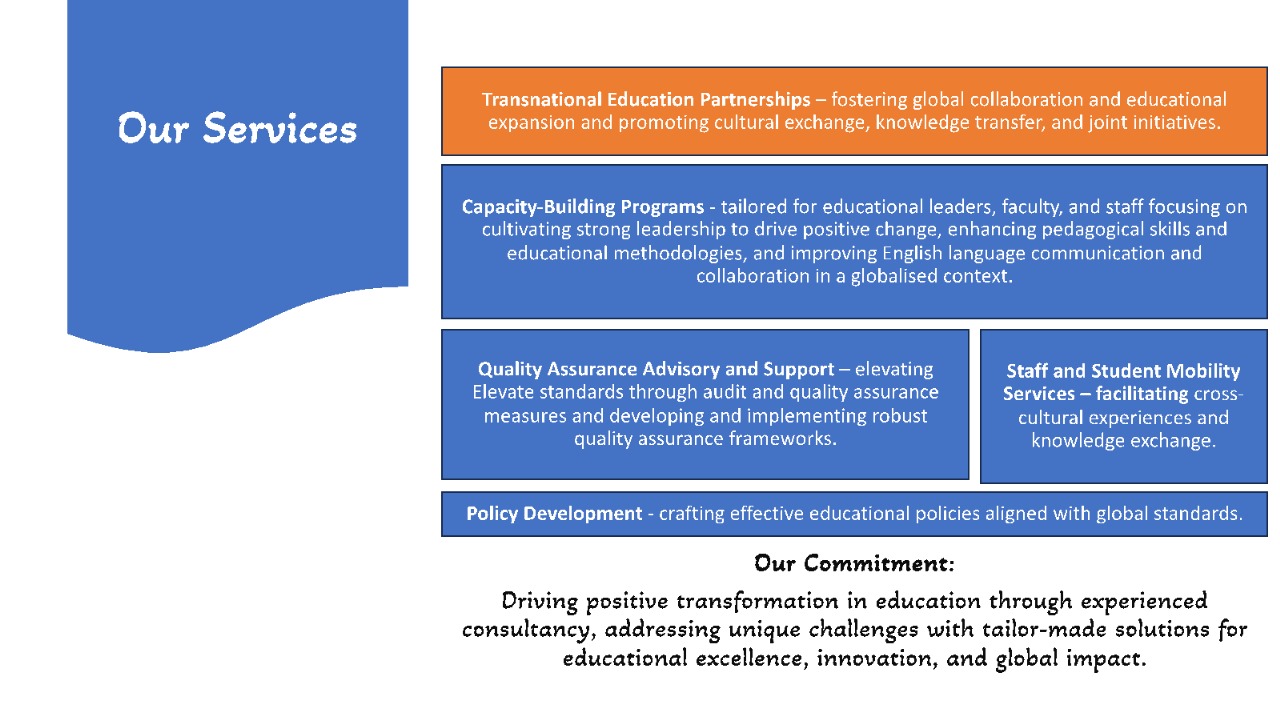 Foster global collaboration and expand educational horizons through our transnational education partnership services. We facilitate meaningful and lasting connections between institutions, promoting cultural exchange, knowledge transfer, and joint initiatives.
